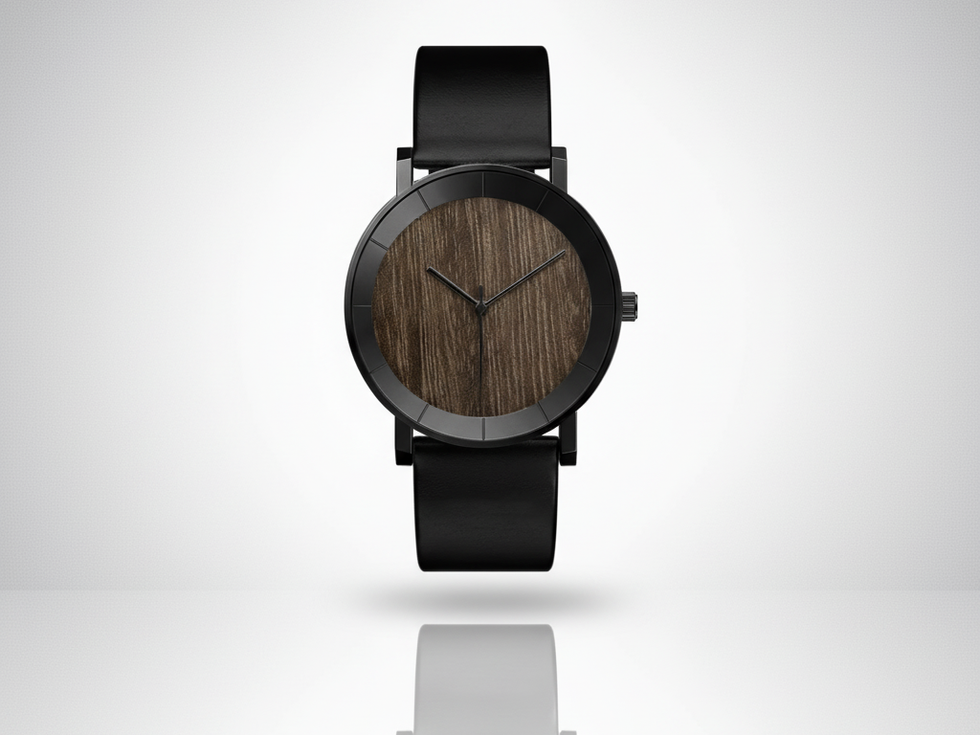 Housed in a corrosion-resistant stainless steel case and fitted with a premium strap (black leather by default; woven and vegan options available), the watch runs on a reliable Japanese quartz movement for daily accuracy. The walnut dial is sealed for protection while preserving tactile texture and natural patina.